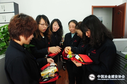 “三八妇女节”来临之际首钢建设集团工会为全集团女工每人发放了一份收纳着剪刀、温度计、化妆镜、烫伤膏、创可贴等美容保健用品的“女工健康包”图为女工姐妹们领到“女工健康包”时开心的情景。 首钢建设集团 赵泽民 摄影报道