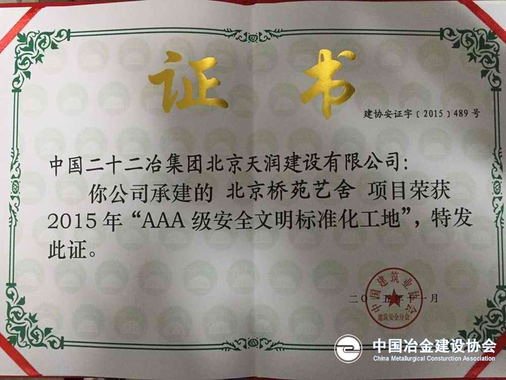 11月6日,中国二十二冶集团北京天润公司承建的北京桥苑艺舍项目获得中国建筑业协会颁发的2015年“AAA级安全文明标准化工地”称号。