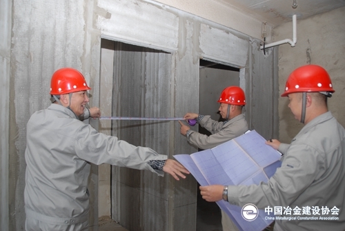 图为工作人员在大公堡住宅小区检查利用尾矿资源研制出的水泥基轻质内隔墙板使用情况。