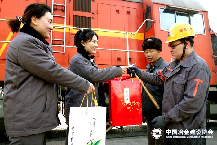 1月9日,河钢唐钢物流分公司工会人员正在运输一线为公司内燃机车司机专业技术比赛获奖选手送证书及慰问品。