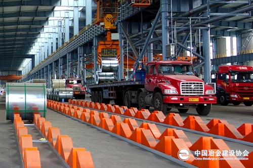 12月12日,河钢唐钢物流公司高强汽车板库区职工正在组织产品外发。