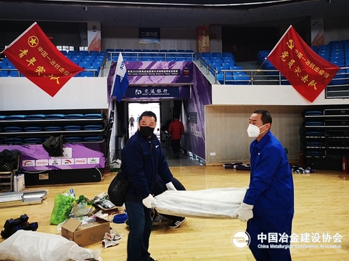 中国一冶党员突击队在武汉洪山体育馆内进行搬运物资。 中国一冶集团 供稿