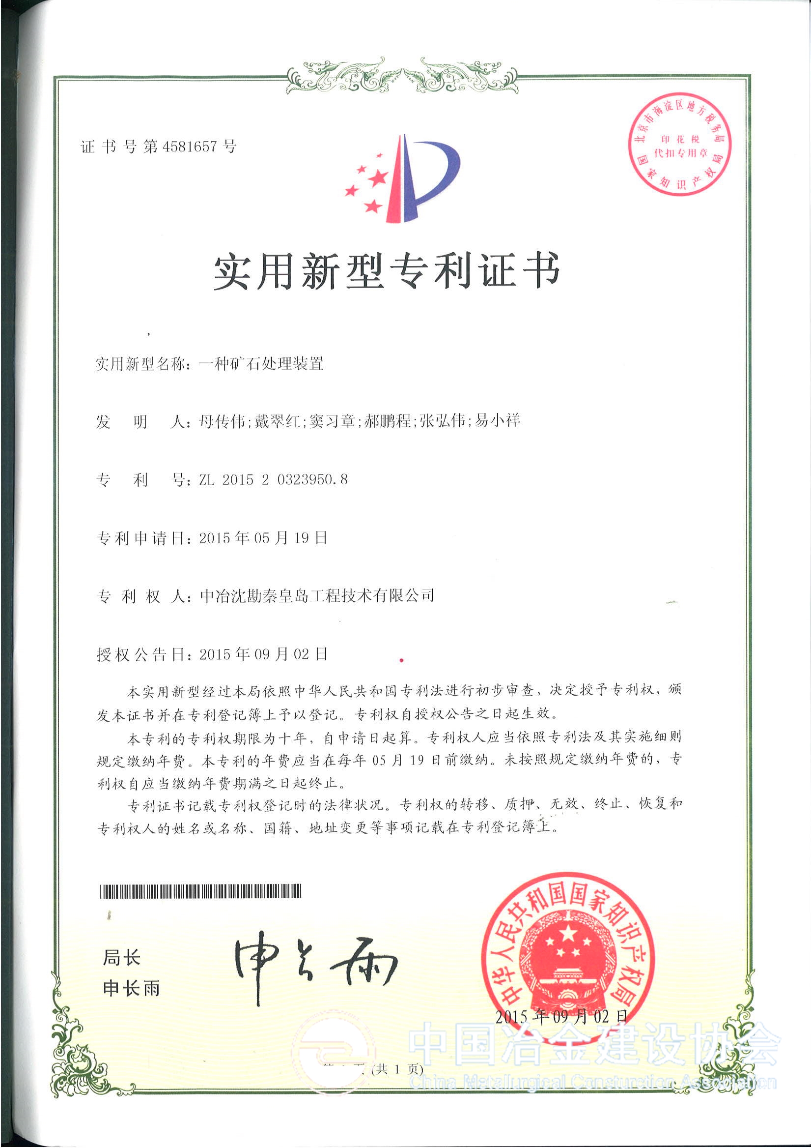 9月17日,中冶沈勘 “一种矿石处理装置”获中华人民共和国知识产权局实用新型专利。