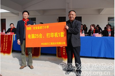 在热烈的掌声中,肖白总经理向虎门小学赠送电脑和打印机,红安县教育局分别向中冶南方、武汉晚报、武汉市青少年发展基金会赠送锦旗。
