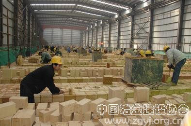 经过5个多月的紧张施工,A焦炉将于2月底完成砌筑,3月1日起进行干码格子砖,正式安装炉体设备,4月1日达到点火条件。图为工程建设者正在进行A焦炉炭化室最后一层砌筑工作。
